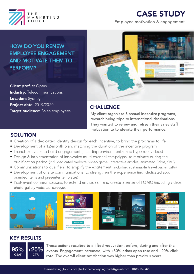 My client organises 3 annual incentive programs, rewards being trips to international destinations. They wanted to renew and refresh their sales staff motivation to to elevate their performance.